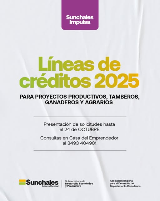 SUNCHALES (De nuestra Agencia). - La Municipalidad recuerda a los interesados que la Asociación Regional para el Desarrollo del Departamento Castellanos, a través de la Subsecretaría de Desarrollo Económico y Productivo de la Municipalidad informan que se encuentra abierta la segunda convocatoria del año 2025 para proyectos productivos tamberos ganaderos y agrarios.