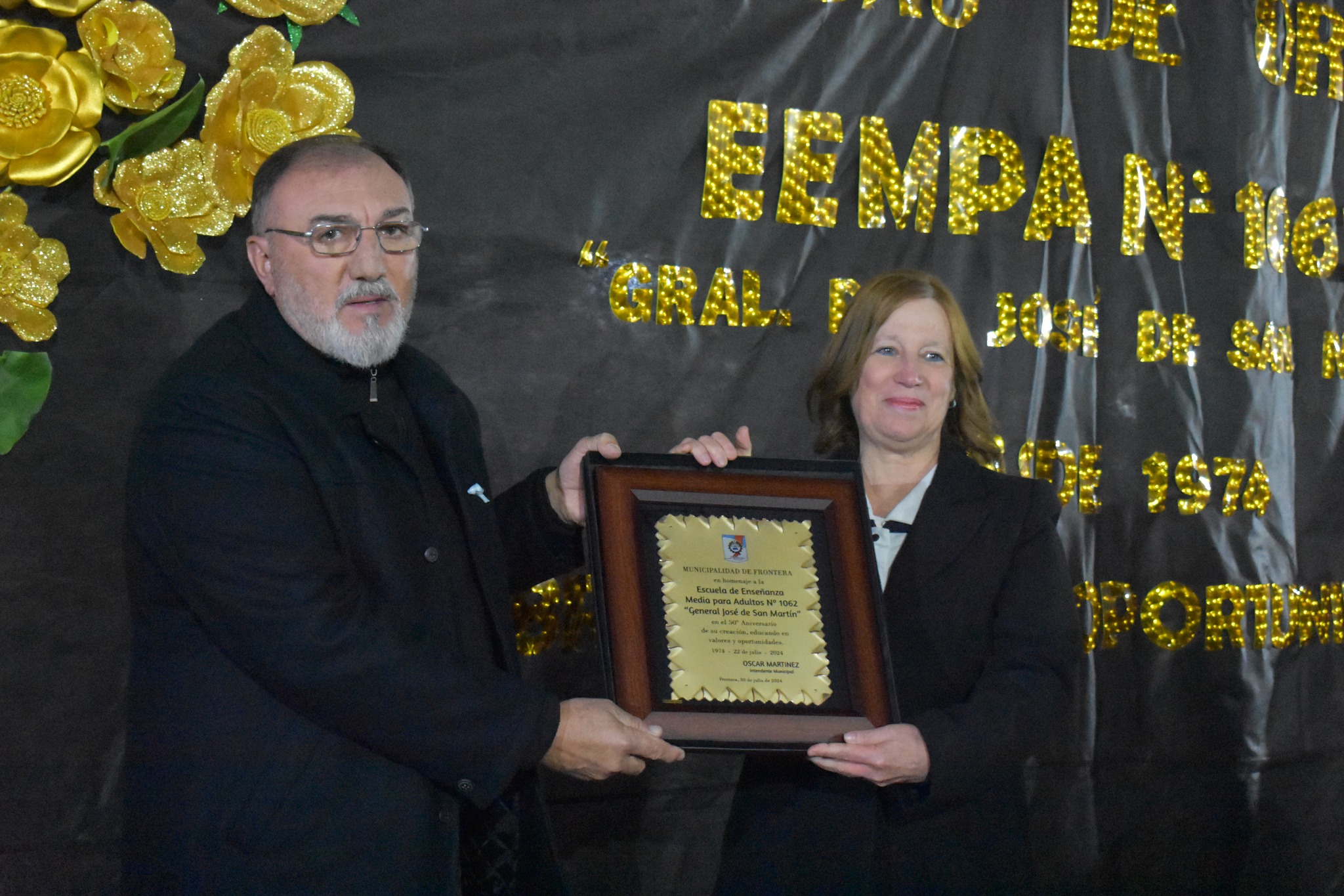 Posterior a su discurso, hizo entrega de una plaqueta a sus directivos, la misma expresaba “Municipalidad de Frontera en homenaje a la Escuela de Enseñanza Media para Adultos N° 1062 General Don José de San Martín en el 50° Aniversario de su creación educando en valor y oportunidades”.