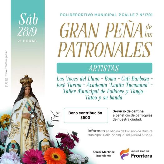 FRONTERA.-El próximo sábado 28 de septiembre, en el Polideportivo Municipal, se llevará a cabo una "Gran Peña" en el marco de las Fiestas Patronales a Nuestra Señora de la Merced.