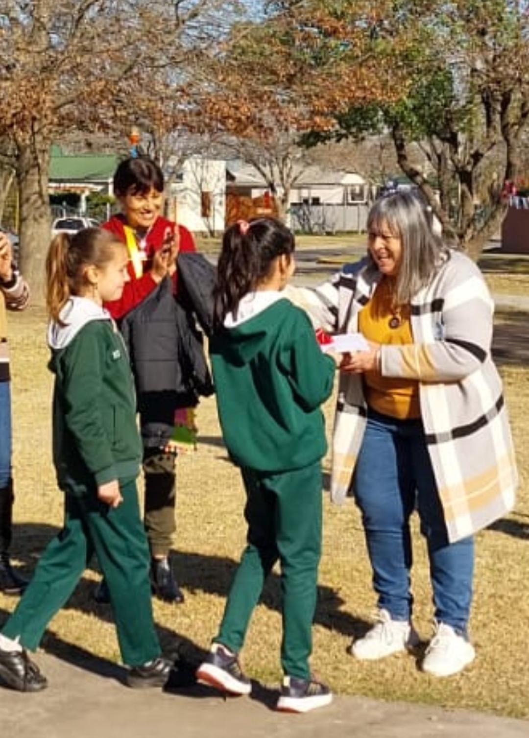 Consiste en ir tejiendo una cadena, enlazando lectores, sumando eslabones de libros ya leídos. El 26/7 dio comienzo en la Escuela 25 de Mayo. El grupo entregó a los alumnos y alumnas de 4to. y 5to. grado un libro que había pertenecido a Felipa Pogonza, la voluntaria de mayor edad del grupo que a fines de 2023 dejó la actividad, pero que hasta ese momento recorrió muchísimas instituciones llevando sus lecturas, su amor por la poesía, su voluntad de seguir leyendo.
