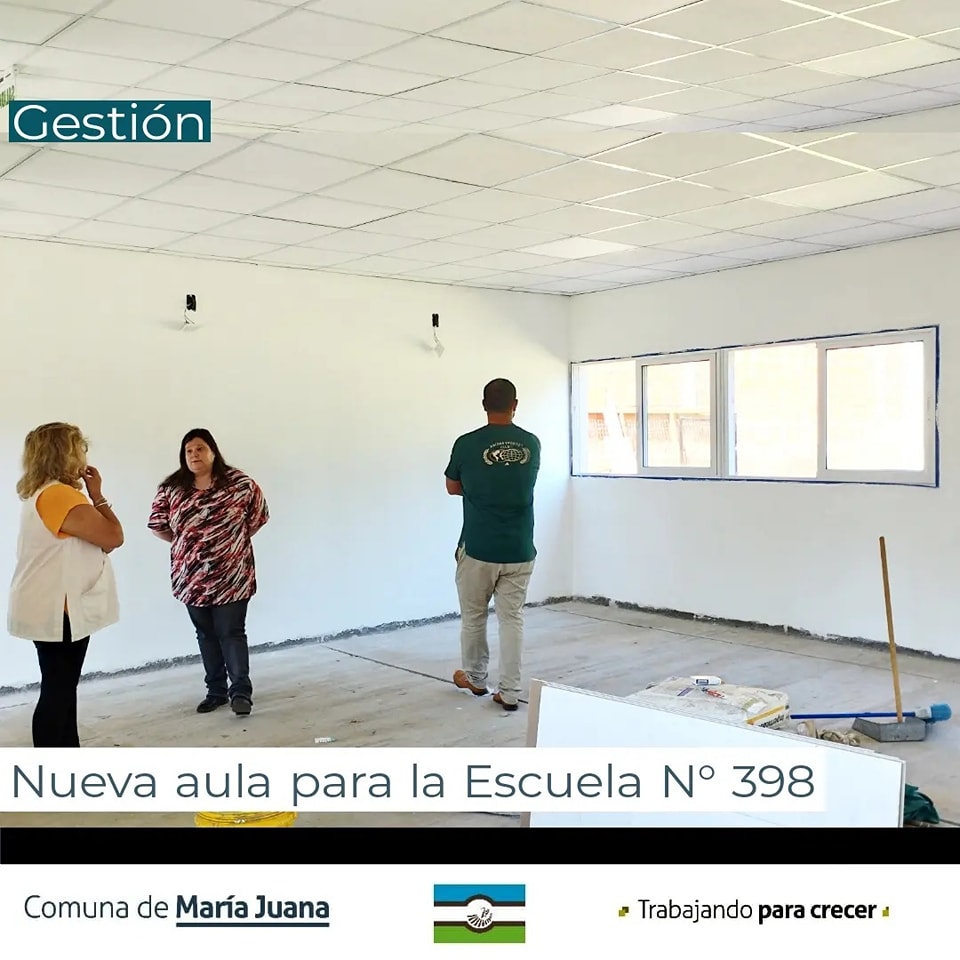 MARÍA JUANA.- La Comuna local puso de relieve su satisfacción por anunciar que la construcción de la nueva aula en la Escuela Domingo Faustino Sarmiento N° 398 avanza rápidamente. Esta importante obra es posible gracias a la gestión de la presidente comunal, Sandra Gaido, al senador Alcides Calvo y al apoyo del programa provincial "1000 aulas".
