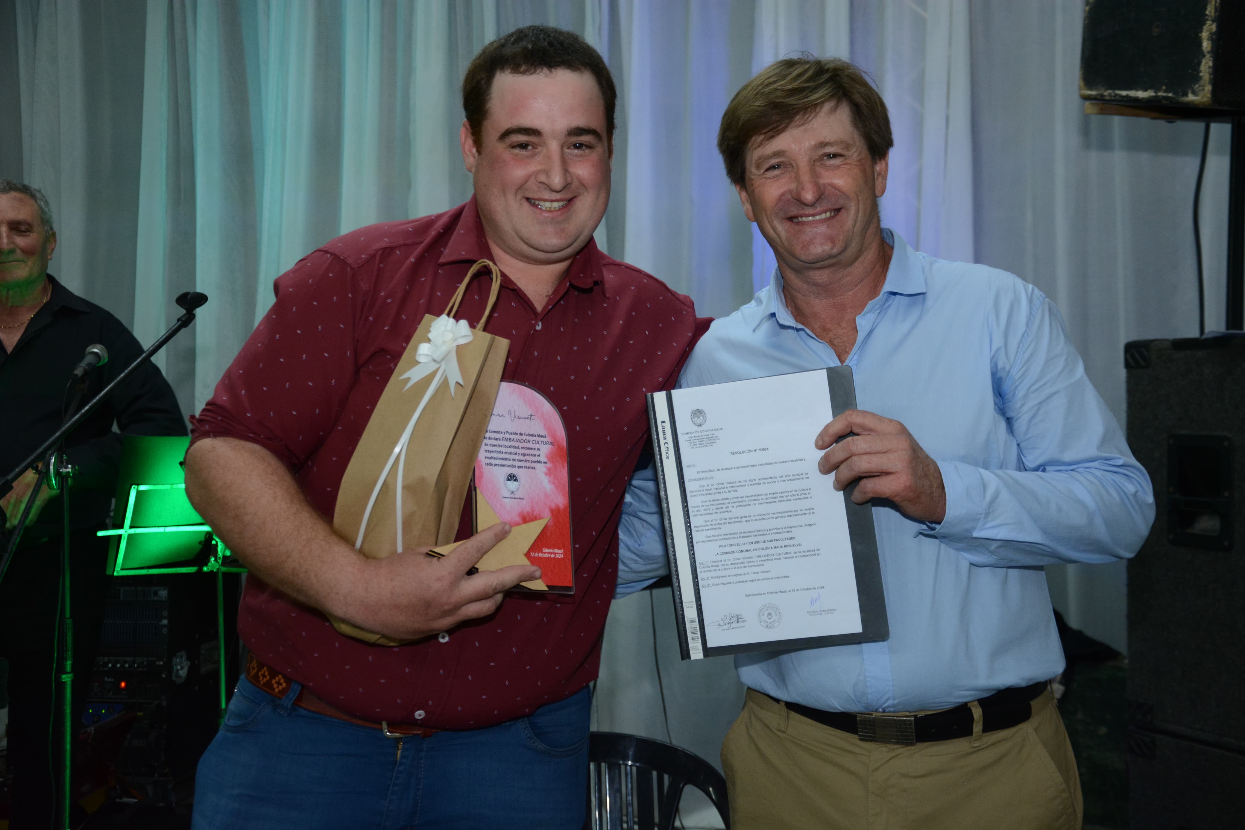 Hoy, –decía el titular de la Comuna, Ricardo Garbagnoli- queremos destacar a una persona muy joven que es artista y que viaja con su arte por el país y países vecinos. Y siempre donde se presenta, lleva prendido en sus palabras el lugar de origen. Siempre junto a él, está el nombre de nuestra pequeña localidad, Colonia Mauá, estoy hablando de Omar Visconti. Entonces-seguía diciendo Garbagnoli- decidimos declararlo “Embajador Cultural” de Colonia Mauá, algo que consideramos bien merecido lo tiene.