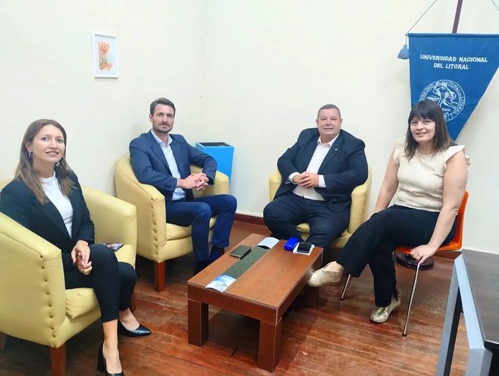 SAN VICENTE.-Ayer, lunes 7 de octubre, el intendente Gonzalo Aira y la secretaria de Innovación y Desarrollo Romina Neiff se reunieron con el rector de la Universidad Nacional del Litoral (UNL), Dr. Enrique Mammarella, y Mariel Pereyra, referente de la sede Rafaela-Sunchales de la UNL.