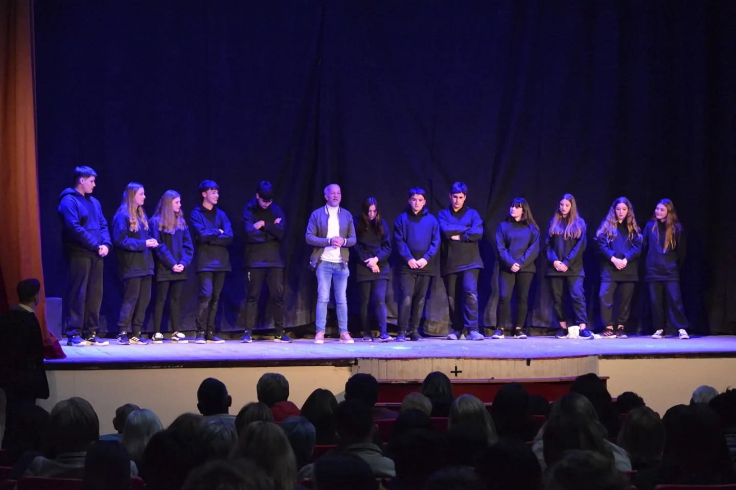 El elenco en el escenario, en el centro el director dirigiéndose al público. Crédito: Prensa Municipalidad