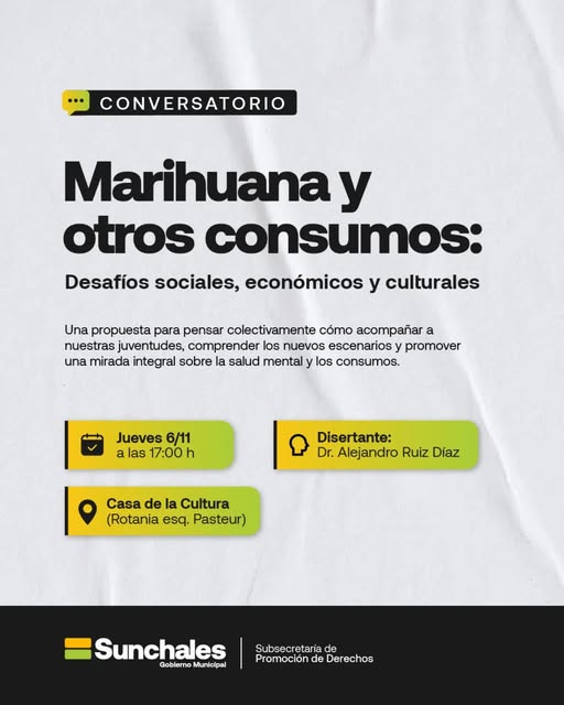 SUNCHALES ( De nuestra Agencia).- Desde el Municipio, hoy, se lanzó una invitación a la comunidad para participar de una realización que será ofrecida por el Dr. Alejandro Ruiz Díaz titulada “Marihuana y otros consumos. Desafíos Sociales, Culturales y Económicos”, la misma no requiere inscripción previa.