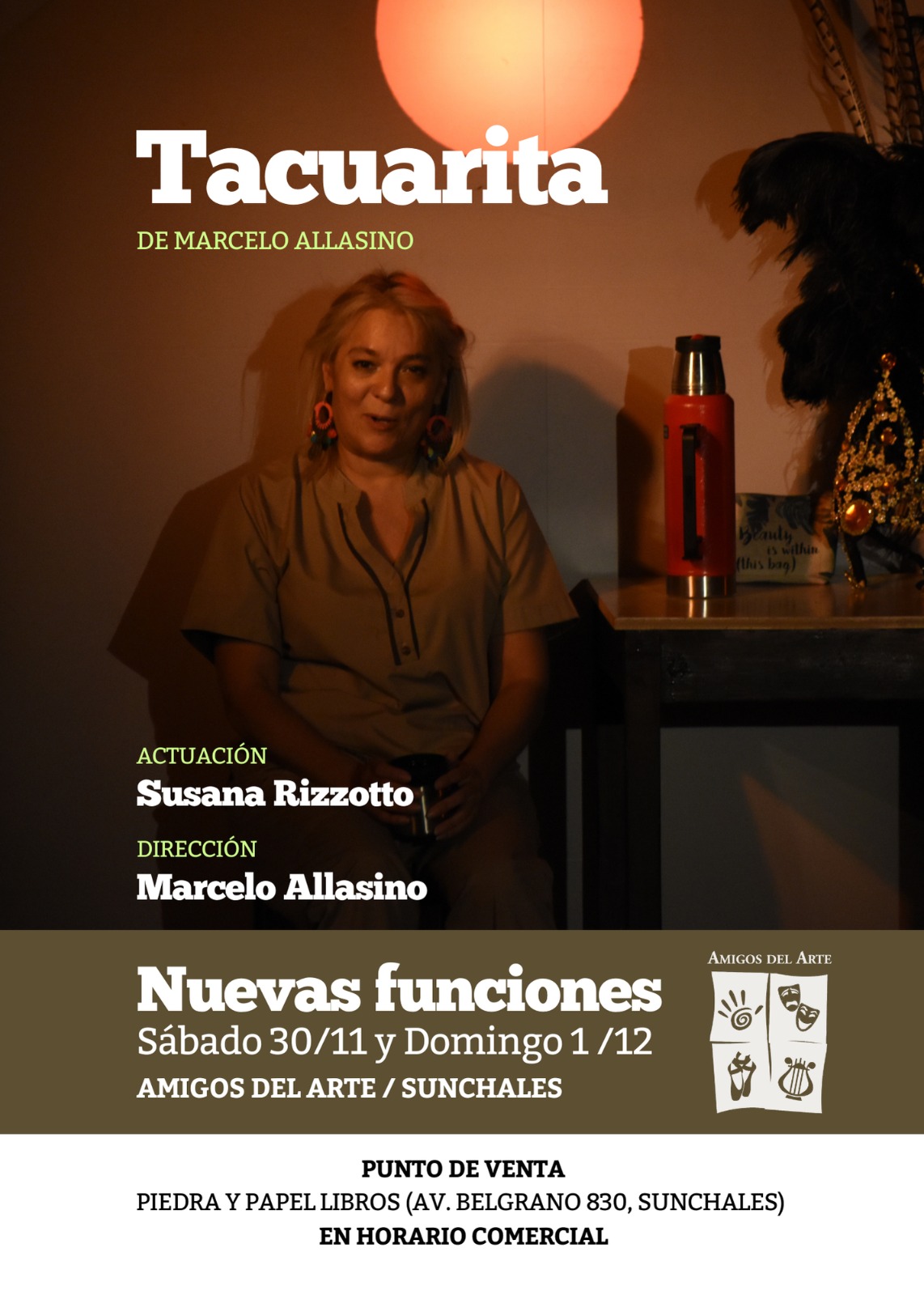 SUNCHALES (De nuestra Agencia).- Hoy, el Centro de Cultura Artística “Amigos del Arte” anuncó nuevas funciones de la obra teatral “Tacuarita”, dirigida por Marcelo Allasino y con la actuación de Susana Rizzotto.