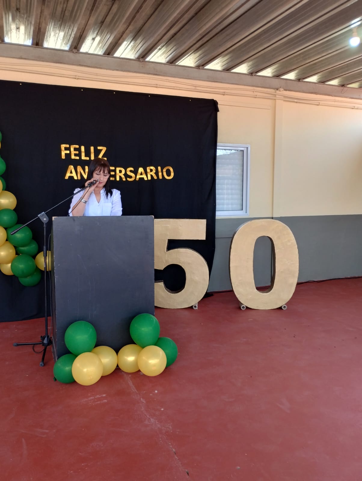 El Padre Fernando Sepertino impartió la bendición, y luego de la actuación de alumnos, hizo uso de la palabra la supervisora de la sección “A” de la Región III - Analía Gómez quien felicitó a la directora y a toda la comunidad educativa por el acontecimiento, dejando de manifiesto que “esto de celebrar 50 años de vida de una escuela, se logra únicamente cuando todos trabajan mancomunadamente. El origen fue ése, trabajaron entre todos para lograr la escuela y hoy, entre todos siguen apoyando la educación todos los días”.
