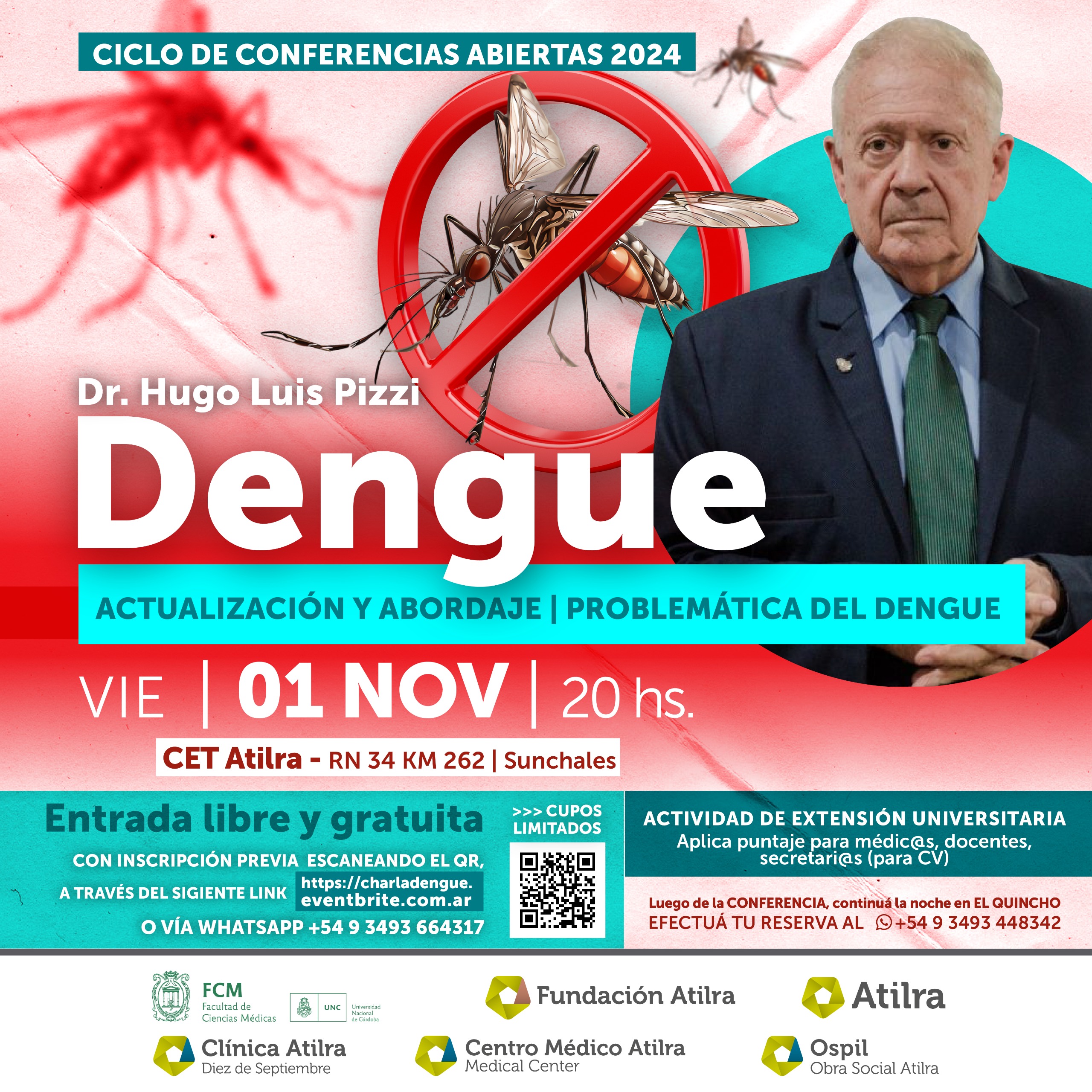 La Conferencia: Dengue “Actualización y abordaje. Problemática del Dengue” se realizará el próximo viernes 01 de noviembre, a las 20hs, en las instalaciones del CET Atilra, donde el Dr. Hugo Luis Pizzi, médico infectólogo referente de esta enfermedad en Argentina, compartirá una instancia de divulgación y actualización, abordando los aspectos más relevantes en la prevención y tratamiento de esta enfermedad.