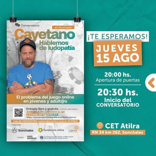 La convocatoria es para las 20:30 con entrada libre y gratutita con inscripción previa, escaneando el QR o a través del siguiente link https://conversatorioludopatia.eventbrite.com.ar/..