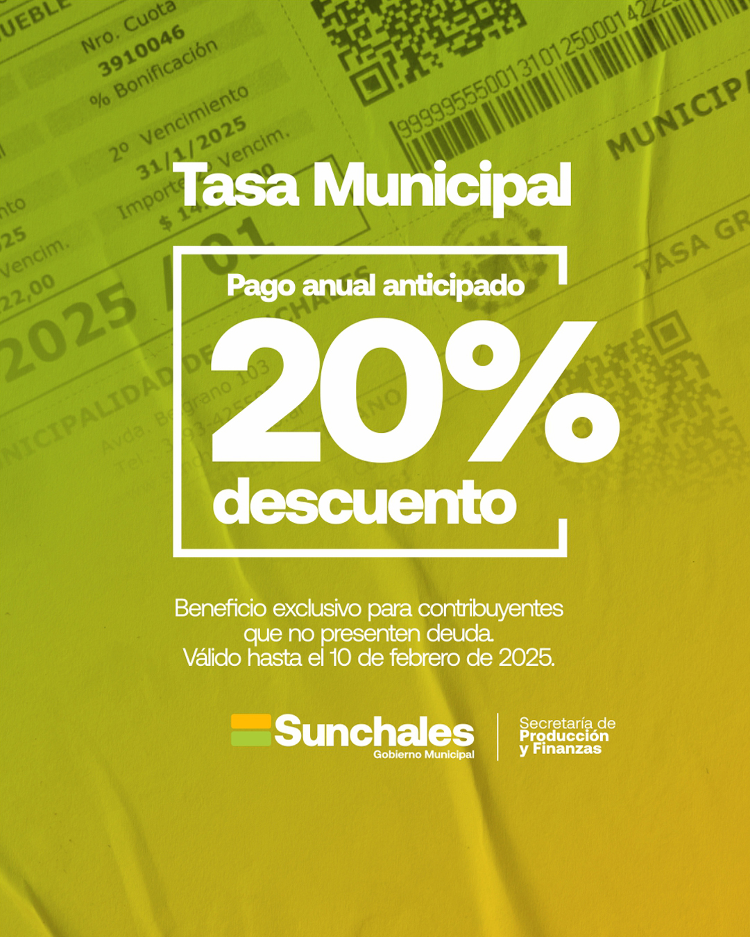 SUNCHALES ( De nuestra Agencia).- Hoy la Municipalidad anunció un interesante descuentos para los contribuyentes que abonen anticipadamente la Tasa de Inmuebles urbanos. Seguidamente se difunde la propuesta hecha conocer desde el Municipio.