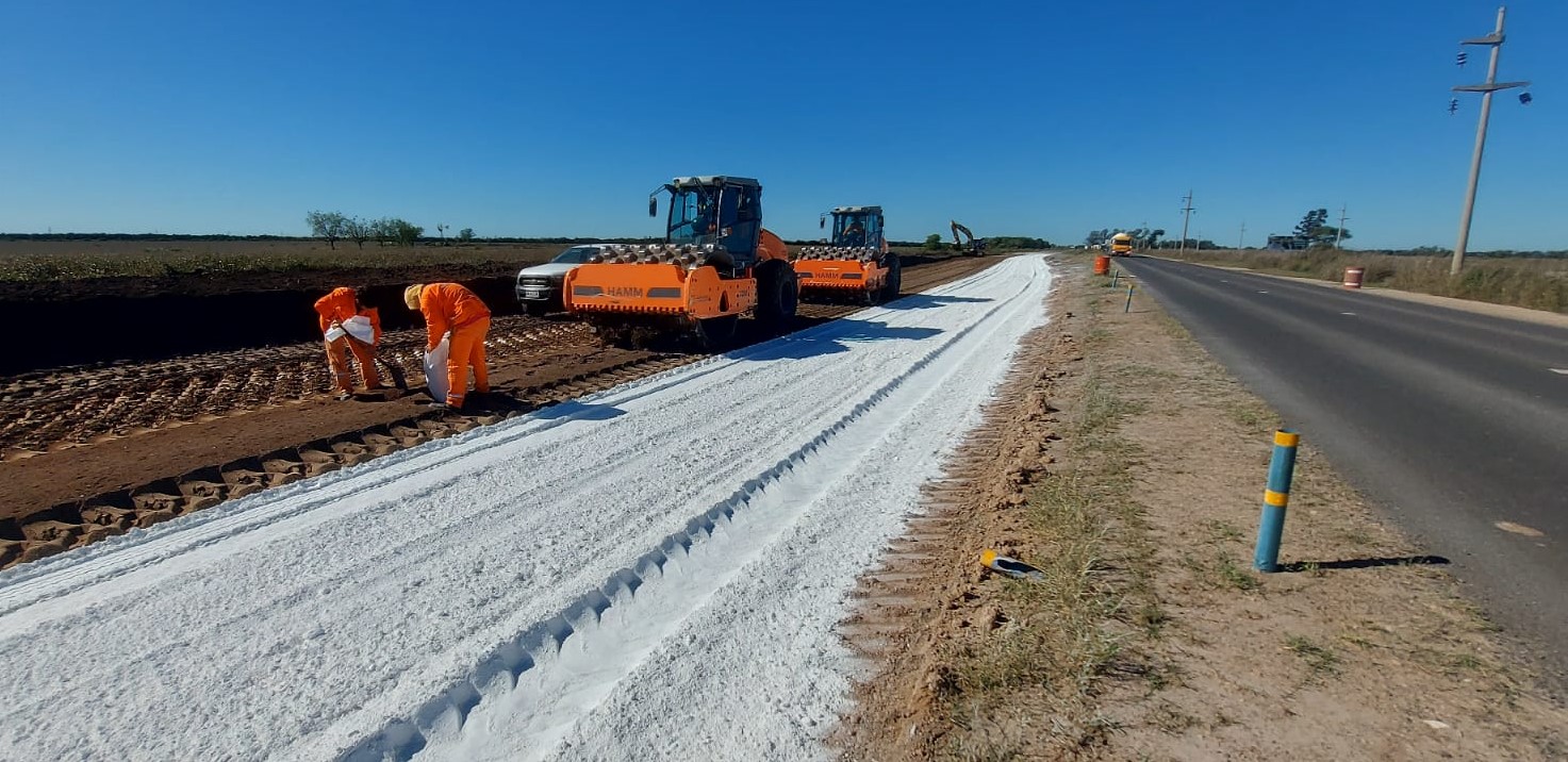 En las tareas principales se procede con la conformación de la base de la calzada y de la rotonda. En el proceso se utiliza suelo seleccionado con agregado de cal para construir el paquete estructural de la nueva autopista.