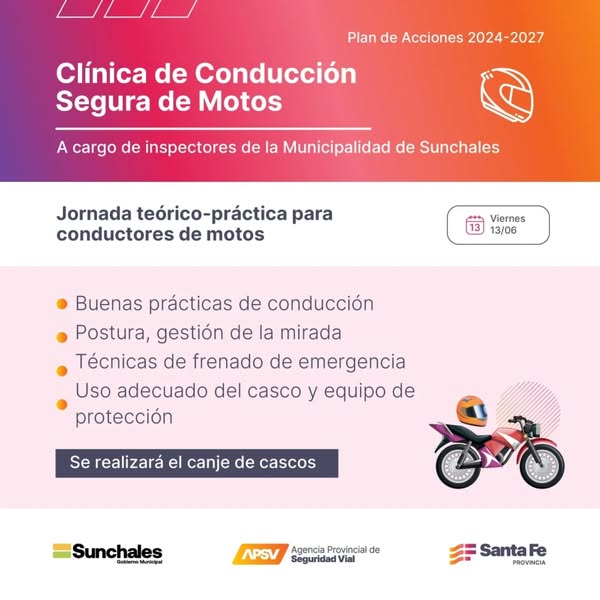 SUNCHALES ( De nuestra Agencia).- Desde el Municipiohoy se anunció la realización de una Clínica de conducción segura de motos, la que será dirigida por inspectores municipales.
