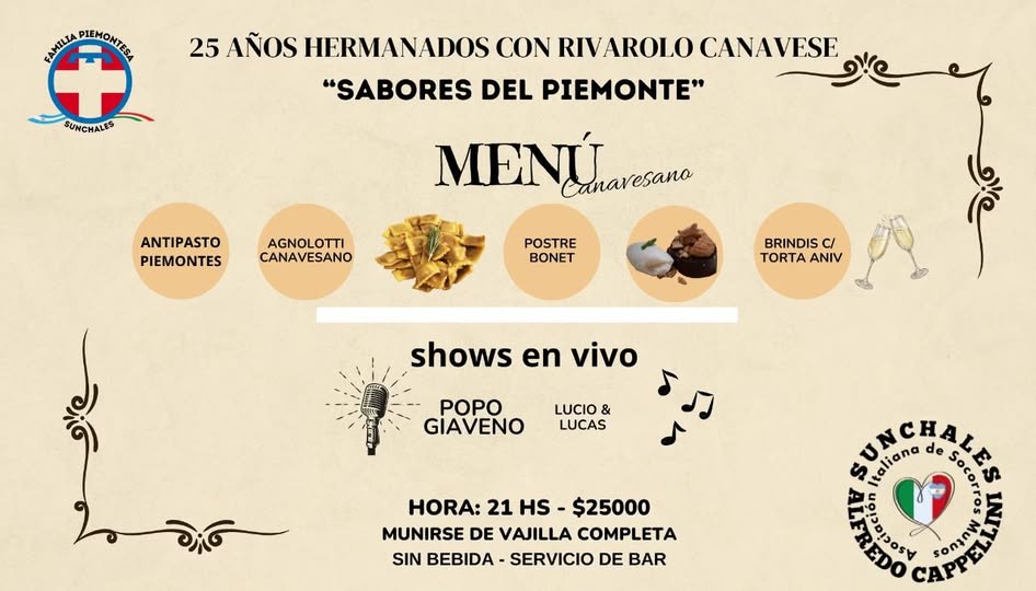 Esta noche especial tendrá lugar el viernes 25 de abril, a las 21:00 hs, en las instalaciones de la Sociedad Italiana. Será una velada dedicada a honrar nuestras raíces y a revivir, a través de los sabores y la música, el espíritu de nuestros antepasados piamonteses que con esfuerzo y dedicación ayudaron a forjar nuestra identidad.