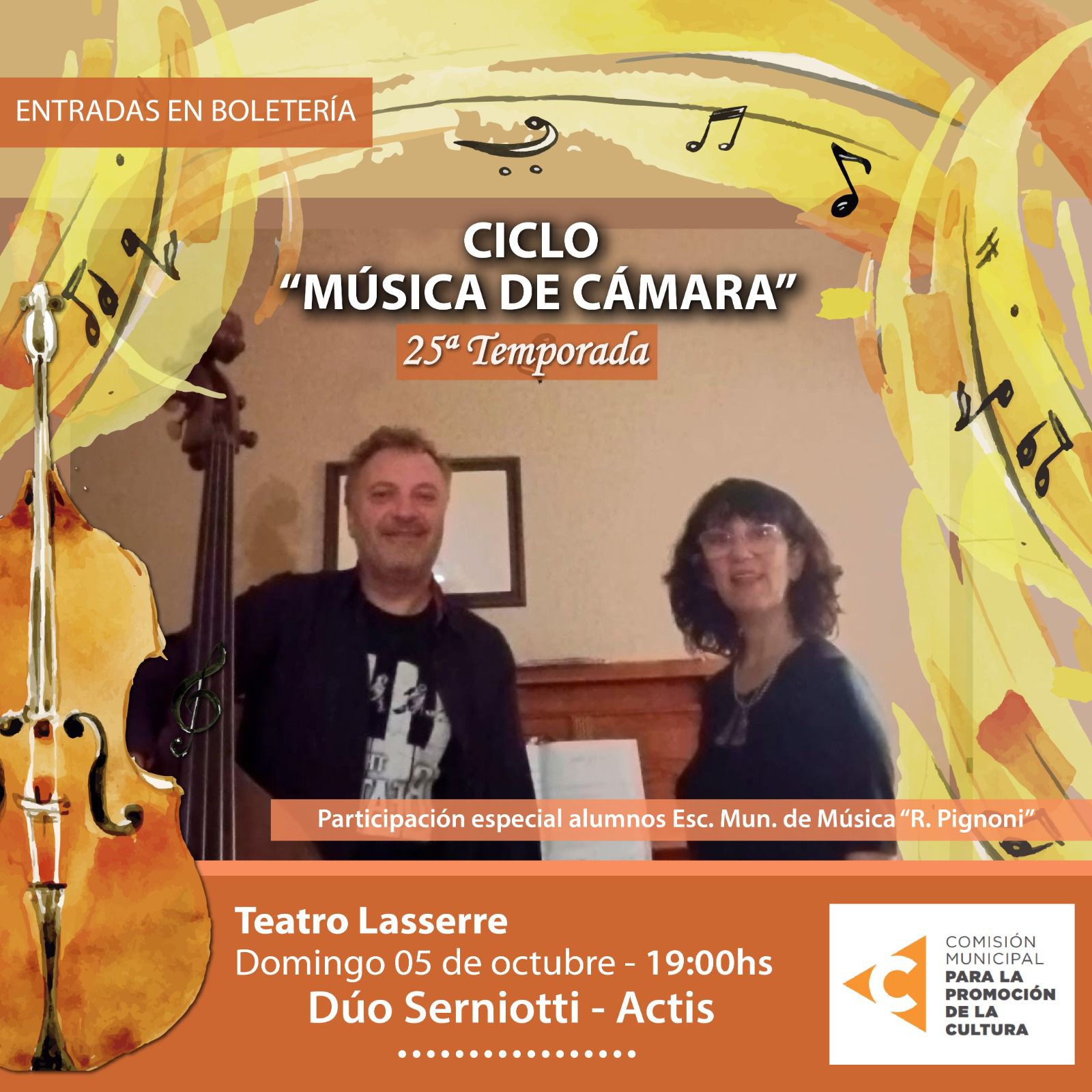 El próximo domingo 5, a la hora 19, se presentará en el Teatro “Lasserre” el Dúo Serniotti – Actis (Piano y Contrabajo), dentro de la programación del Ciclo Música de Cámara que organiza el Centro Ciudad de Rafaela, con el apoyo de la Comisión Municipal para la Promoción de la Cultura.