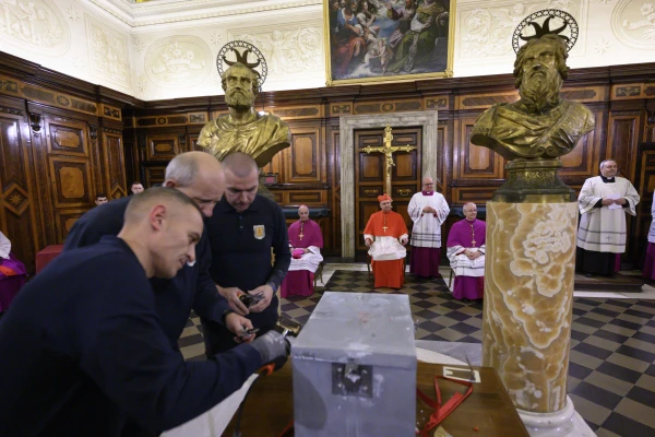 Los participantes del rito se dirigieron después a la Sala Capitular, donde se abrió la caja metálica extraída de la Puerta Santa. Estuvieron presentes Mons. Rino Fisichella, Pro-Prefecto del Dicasterio para la Evangelización, y el arzobispo Mons. Diego Ravelli, Maestro de las Celebraciones Litúrgicas Pontificias, quien recibió los documentos y objetos de la recognitio, que serán entregados mañana por la tarde al Papa Francisco.