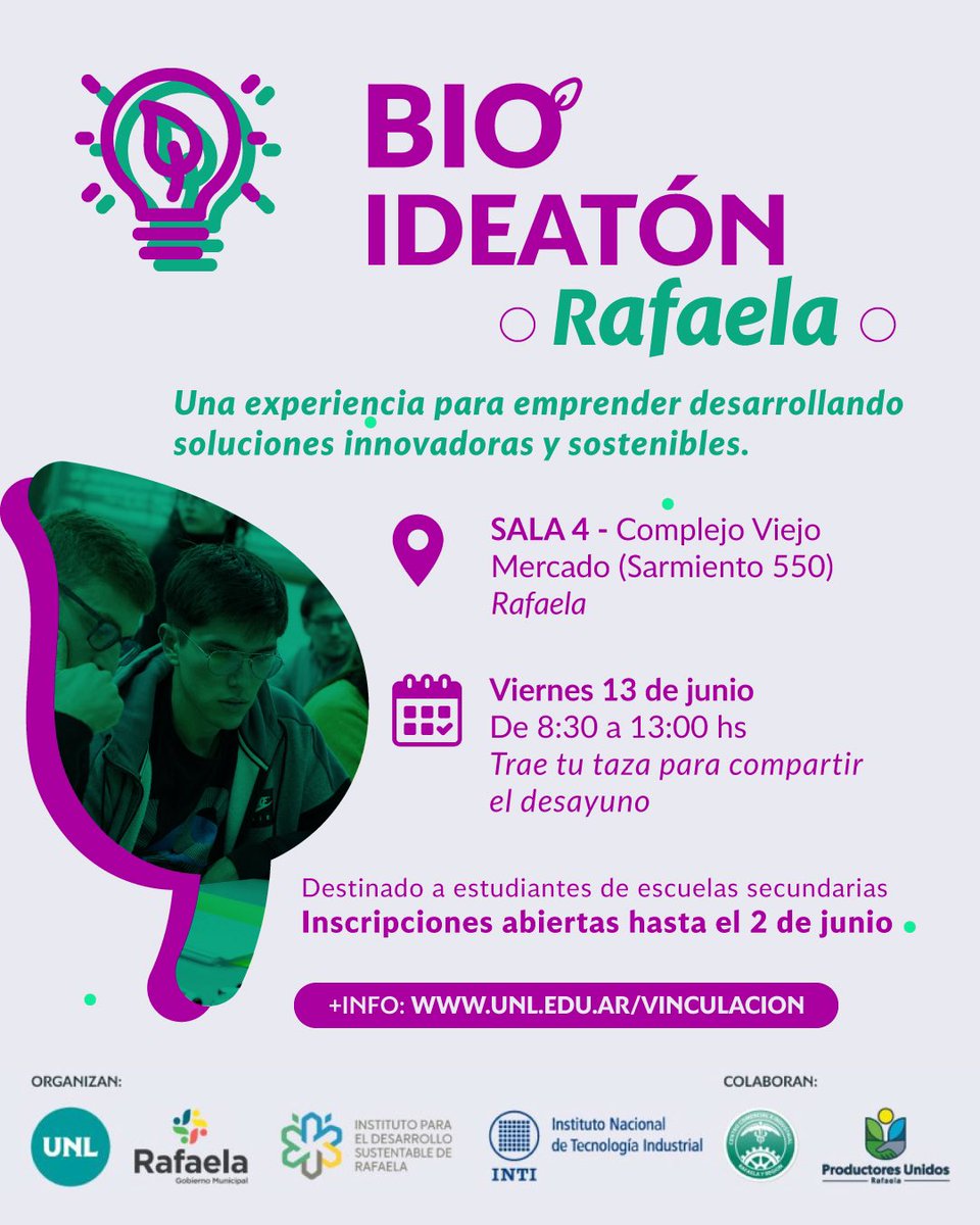 El viernes 13 de junio a partir de las 8:30, en el Complejo Cultural del Viejo Mercado, se realizará una nueva edición del Bio Ideatón Rafaela: Impulsando soluciones sostenibles; una propuesta dirigida a estudiantes de cuarto, quinto y sexto año de todas las escuelas secundarias de la ciudad.