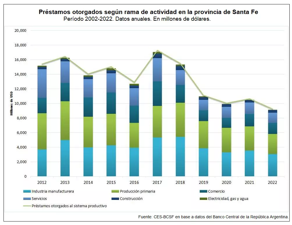 Al observar las diferentes ramas de actividad, en 2022 se destaca como principal demandante de préstamos a la Industria Manufacturera con un total de USD 29.372 millones, lo que representa un 24,2%. En su interior se destacan las empresas que se dedican a la Elaboración de productos alimenticios y bebidas (10,1%), siguiendo en importancia los rubros de Fabricación de sustancias y productos químicos (3,4%) y Fabricación de maquinarias y equipos (2,3%).