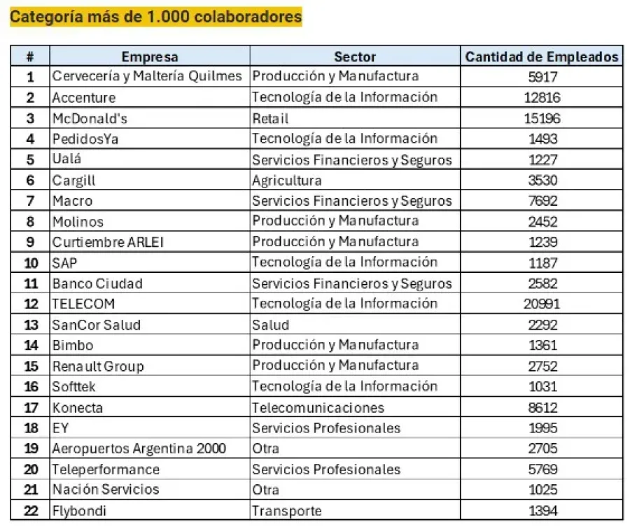Según ese trabajo, Cervecería Quilmes, Accenture y Mc Donalds se situaron en lo más alto del podio entre las compañías de más de 1000 empleados, mientras que DHL, Hilton y AES ocuparon los primeros puestos en la categoría de 251 a 1000 colaboradores.