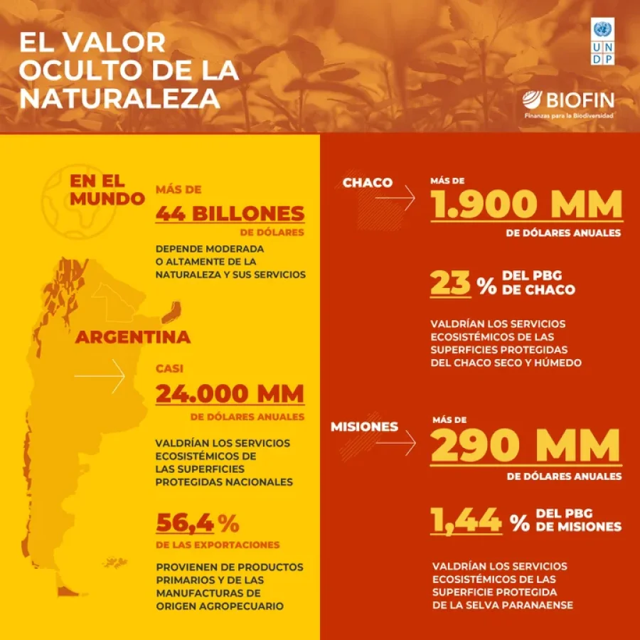 El informe "La riqueza cambiante de las naciones del Banco Mundial (2021)" revela que en el sistema del cuentas nacionales argentinas no figura el valor de servicios ecosistémicos de las superficies protegidas de la jurisdicción nacional, que representan casi US$24 mil millones anuales (específicamente unos US$ 23.933.300.386).