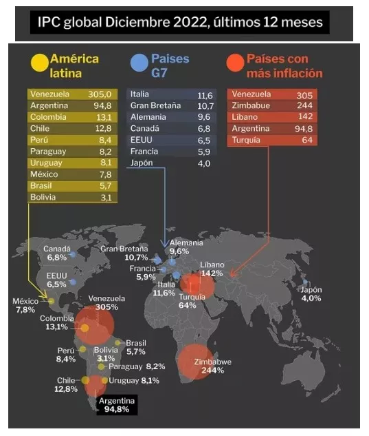 Venezuela cerró el 2022 como el país del continente americano que más inflación acumuló: 305,7%, según cifras del Observatorio Venezolano de Finanzas (OVF) y 234% según cifras del Gobierno. También Argentina estuvo entre los países con más inflación del mundo, tras haber terminado el año pasado con un Índice de Precios al Consumidor (IPC) del 94,8%.