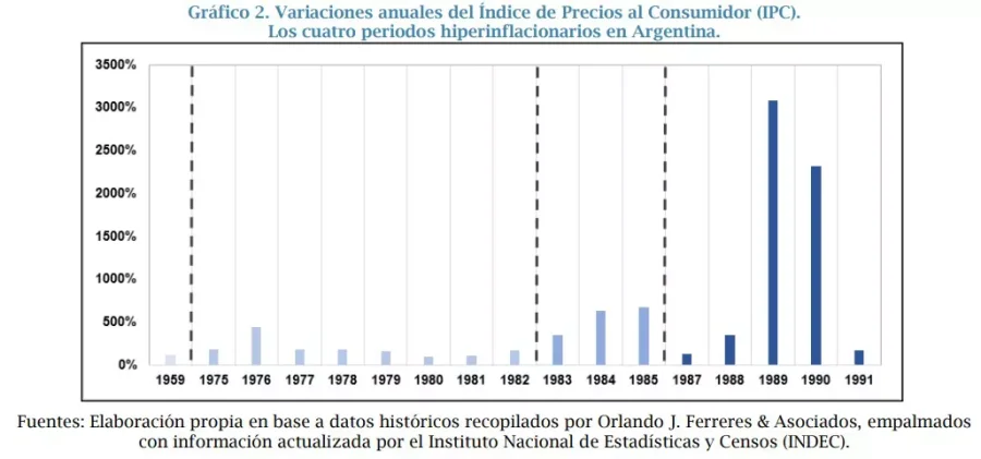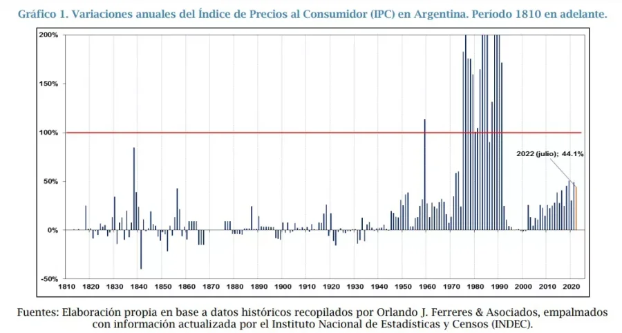 A lo largo de su historia, Argentina ha padecido numerosos ciclos inflacionarios, cuatro hiperinflaciones y sólo algunos períodos cortos de estabilidad de precios. En términos estadísticos, los últimos 210 años registran una tasa de inflación promedio de 51% anual, siendo el máximo histórico de 3.079,5% en el año 1989. Aún sacando del cálculo los años hiperinflacionarios, el promedio anual de inflación en Argentina entre 1810 y 2022 se ubica en 8,8%.