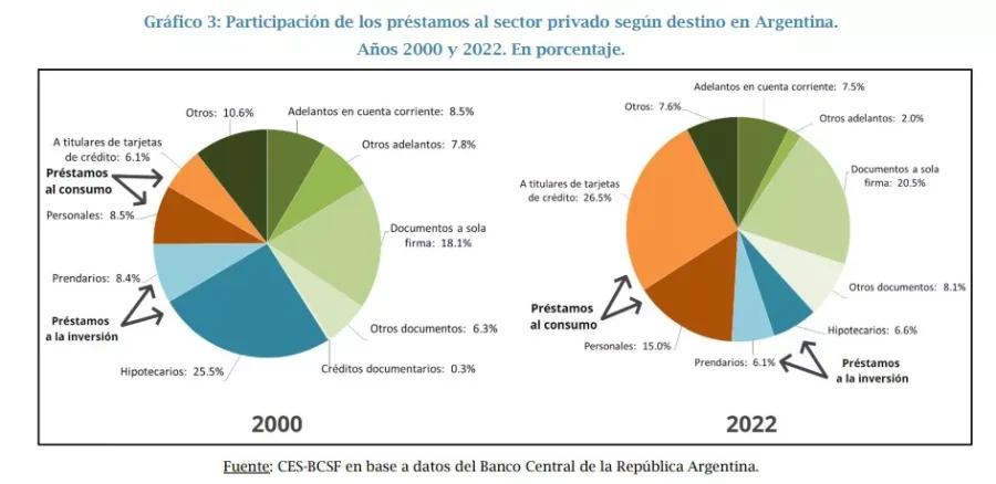 La foto hace 20 años era muy distinta: los préstamos hacia titulares de tarjetas de crédito representaban únicamente 6,1% del total y los préstamos personales, por su parte, rondaban en un 8,5% (valuados en USD 3.896 millones y USD 5.427 millones, respectivamente). En forma agregada, ambas categorías explicaban un 14,5% del total mientras que, los préstamos a la inversión contabilizan el 33,9% del crédito privado, por un valor de USD 21.771 millones -casi 8 veces más que en 2022-.