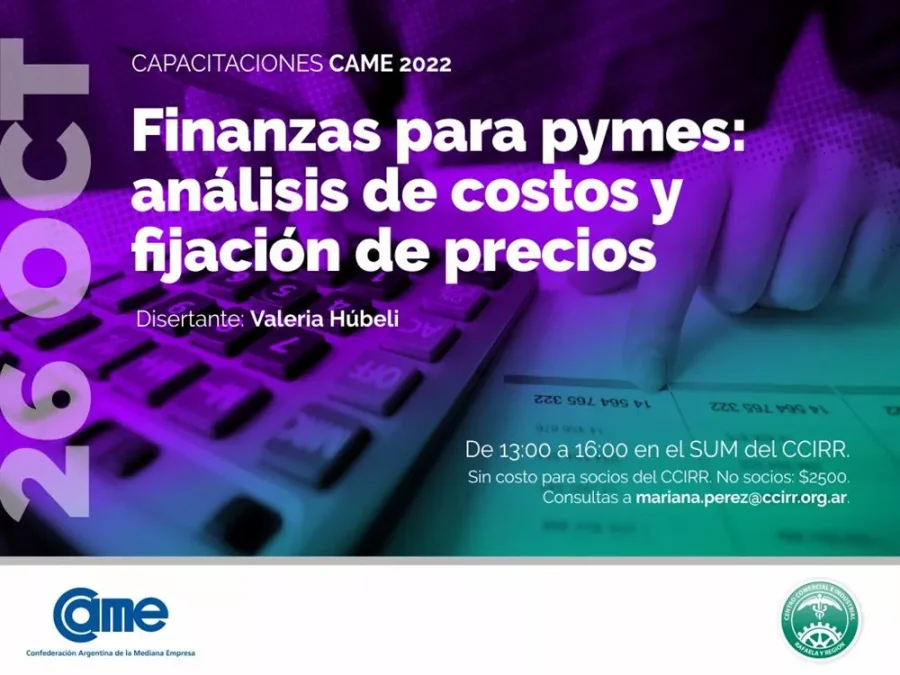 En el marco del Ciclo de Capacitaciones CAME que el Centro Comercial e Industrial de Rafaela y la Región (CCIRR) ha preparado para el 2022, el miércoles 26 de octubre se desarrollará la charla Finanzas para pymes: análisis de costos y fijación de precios. La clase se dictará de forma presencial, en el SUM del CCIRR, de 13:00 a 16:00 y la docente a cargo de la actividad será Valeria Húbeli.