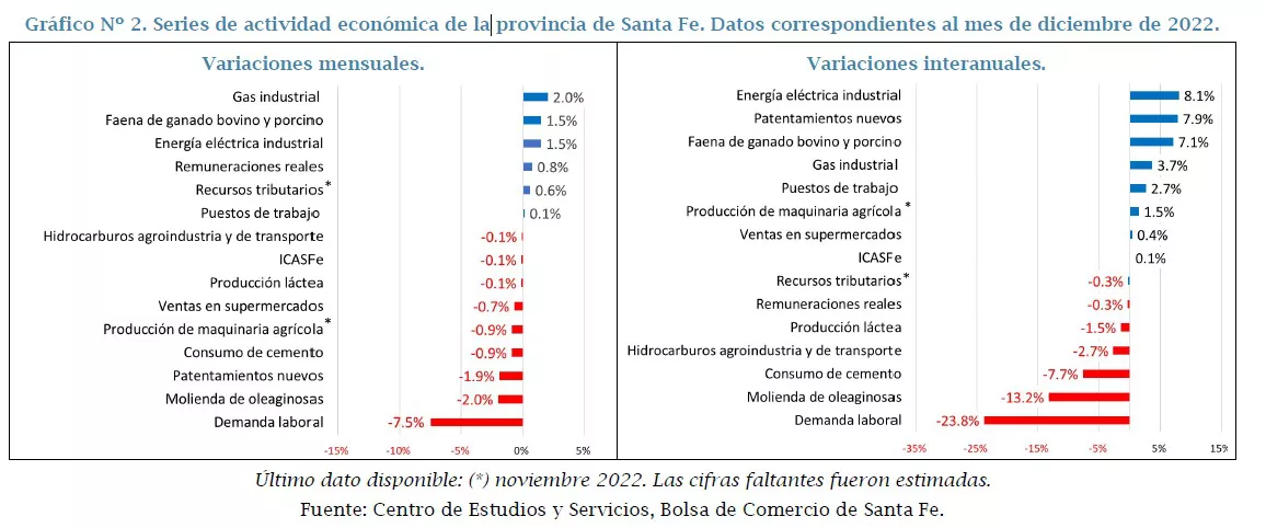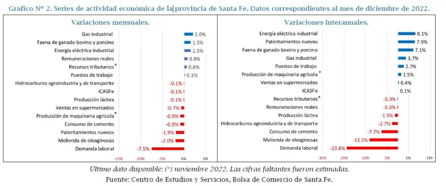 En diciembre de 2022 sólo seis de las catorce series presentaron variaciones mensuales positivas, mientras que el resto evidenció un desempeño negativo. En la medición interanual la mitad de las series presentaron variaciones positivas, y la otra mitad, negativas.