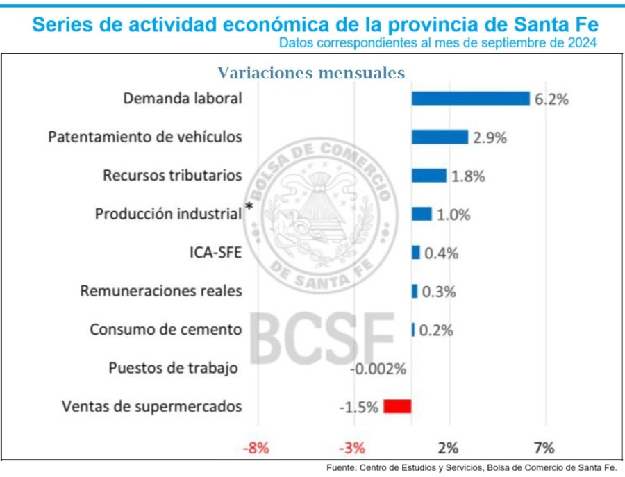 En septiembre de 2024, seis de los ocho indicadores representativos de la actividad económica provincial obtuvieron resultados favorables e incluso tres de ellos mostraron mejoras interanuales, según muestra el Índice Compuesto Coincidente de Actividad Económica de la provincia de Santa Fe (ICA-SFE) que elabora el Centro de Estudios y Servicios de la Bolsa de Comercio de Santa Fe (CES-BCSF).