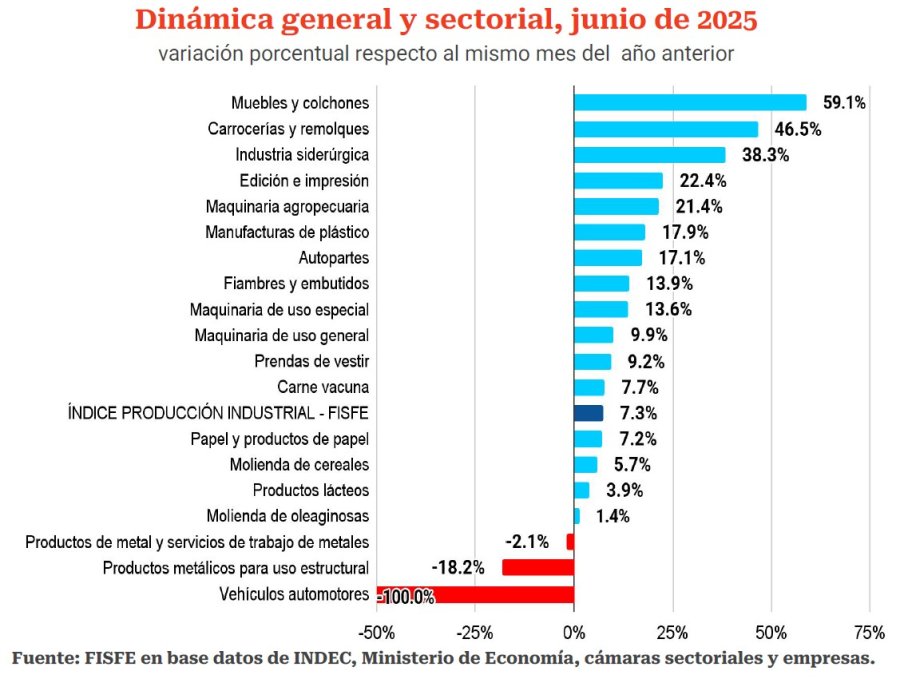 Según FISFE, las ramas de actividad de mayor contribución al producto industrial en la provincia de Santa Fe presentaron en junio último los siguientes resultados en relación al mismo mes del año anterior: Muebles y colchones (+59,1%), Carrocerías-Remolques (+46,5%), Industria siderúrgica (+38,3%), Edición e impresión (+22,4%),