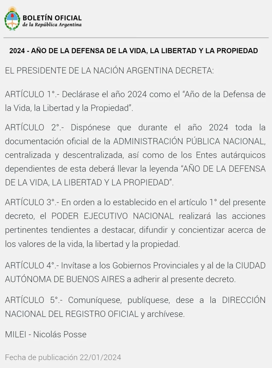 El cambio es brutal, y no solo en el modelo económico, sino también en el plano político y social -quizás también en el orden cultural-. El pasado lunes, el Gobierno Nacional declaró, a través del decreto N°55/2024, al 2024 como el "Año de la Defensa de la Vida, la Libertad y la Propiedad" por lo que toda la documentación oficial de la Administración Pública Nacional, centralizada y descentralizada, así como de los entes autárquicos, deberá llevar la leyenda durante el corriente año.