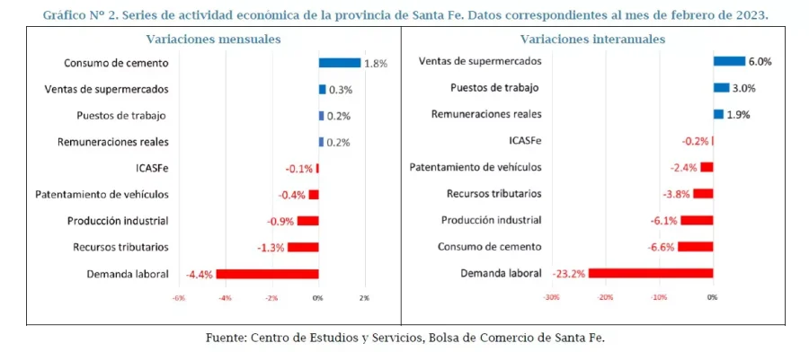 El ICASFe, que resume el desempeño de los indicadores representativos de la actividad económica provincial, marcó en febrero una disminución del 0,1%, respecto a enero según el informe elaborado por la Bolsa de Comercio de Santa Fe a través de su Centro de Estudios y Servicios.