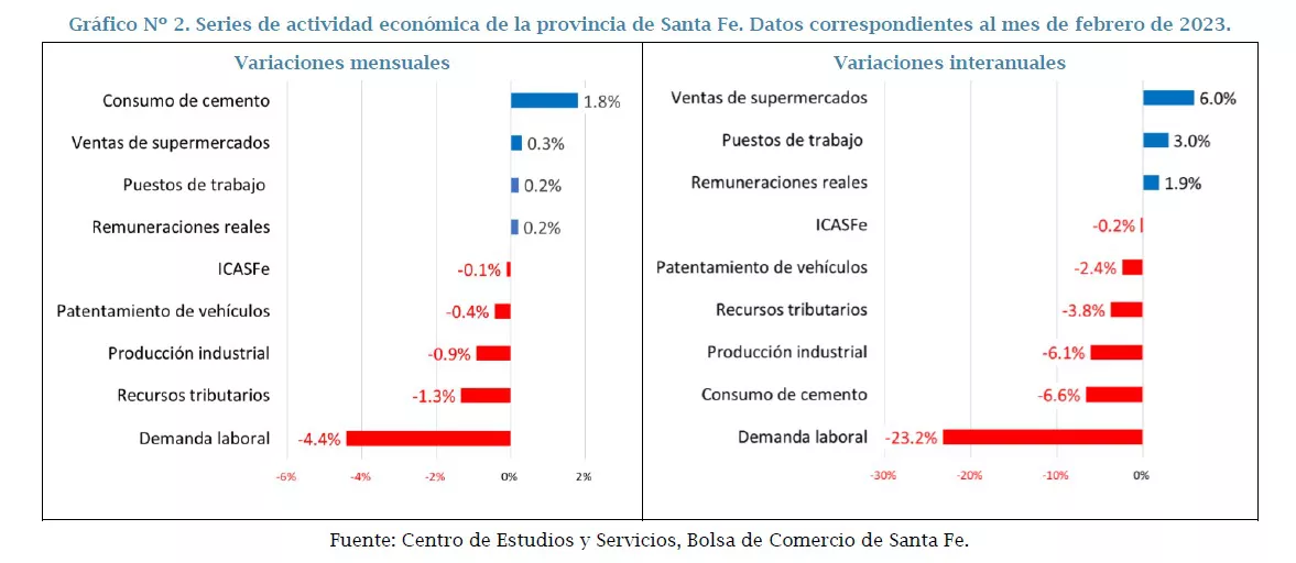 Con datos a febrero de 2023 la variación interanual del ICASFe sigue dando cuenta del estancamiento de la actividad económica provincial durante el último año, registrándose una tasa del -0,2% con respecto a igual mes de 2022.
