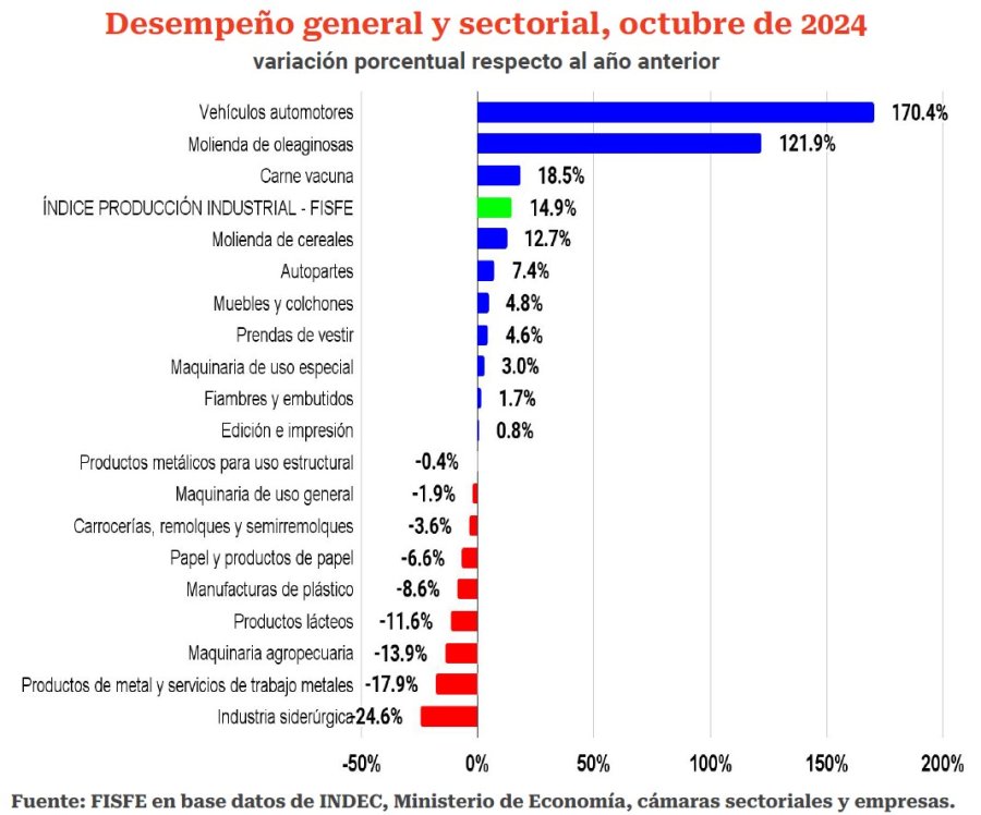 En este sentido, las ramas de actividad de mayor contribución al producto industrial en la provincia de Santa Fe presentaron en octubre de 2024 los siguientes resultados en relación al mismo mes del año anterior: Vehículos automotores (+170,4%), Molienda de oleaginosas (+121,9%), Carne vacuna (+18,5%), Molienda de cereales (+12,7%), Autopartes (+7,4%), Muebles y colchones (+4,8%), Prendas de vestir (+4,6%), Maquinaria de uso especial (+3,0%), Fiambres y embutidos (+1,7%), Edición e impresión (+0,8%), Productos metálicos para uso estructural (-0,4%), Maquinaria de uso general (-1,9%), Carrocerías-Remolques (-3,6%), Papel y productos papel (-6,6%), Manufacturas de plástico (-8,6%), Productos lácteos (-11,6%), Maquinaria agropecuaria (-13,9%), Productos de metal y servicios de trabajo metales (-17,9%), e Industria siderúrgica (-24,6%).