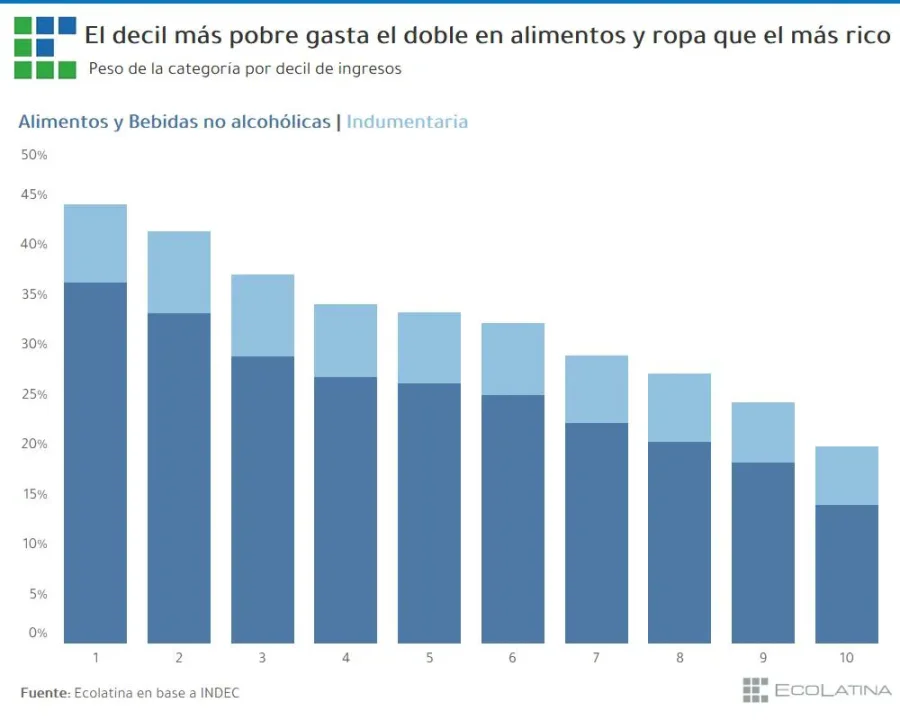 Así, vemos que mientras que el gasto en alimentos y bebidas e indumentaria representa casi la mitad (44%) del gasto del 10% de los hogares más pobres, en el 10% de los hogares más ricos estos dos rubros explican menos de un 20%, menos de la mitad.