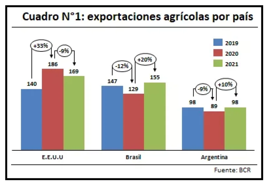 Argentina se encuentra tercero en el ranking de exportadores de commodities agrícolas: en el año 2020 exportó 89,3 millones de toneladas y se espera un incremento del 10% en el 2021 (98,3 millones de toneladas). El primer puesto es ocupado por Estados Unidos que exportó 186,3 millones de toneladas en el 2020, proyectándose en el 2021 un caída del 9% con respecto al año pasado (169,1 millones de toneladas). En el segundo lugar se encuentra Brasil, que exportó en el 2020 129,3 millones de toneladas, con una proyección de crecimiento del 20% en el 2021 (155,1 millones de toneladas).