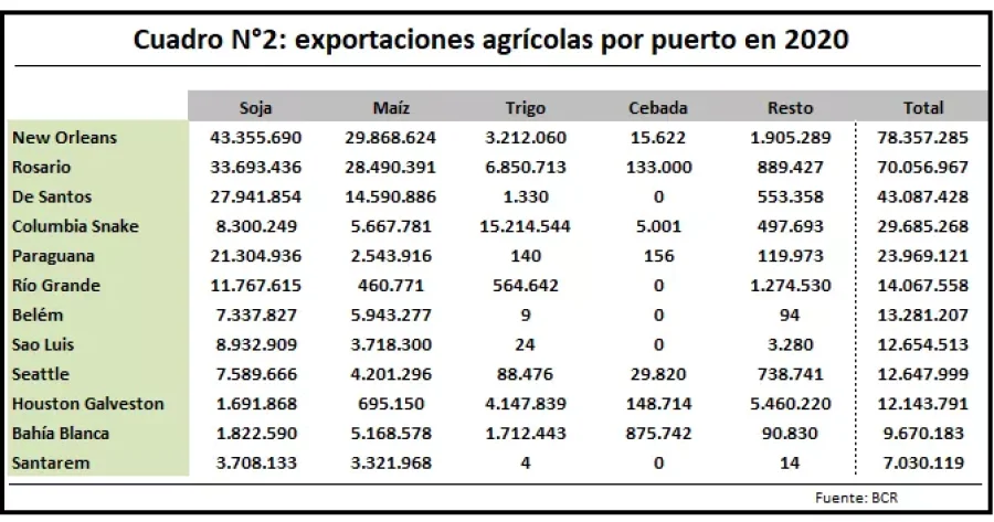 En lo que se refiere a los productos embarcados, el complejo exportador del Gran Rosario ocupó el segundo lugar en cantidades exportadas tanto para la soja y subproductos (poroto, harinas y aceites), como en el caso maíz y el trigo (grano y harina). Cabe remarcar la importancia del puerto de Bahía Blanca en la exportación de soja, maíz y cebada, alcanzando los 9,6 millones de toneladas en el 2020.