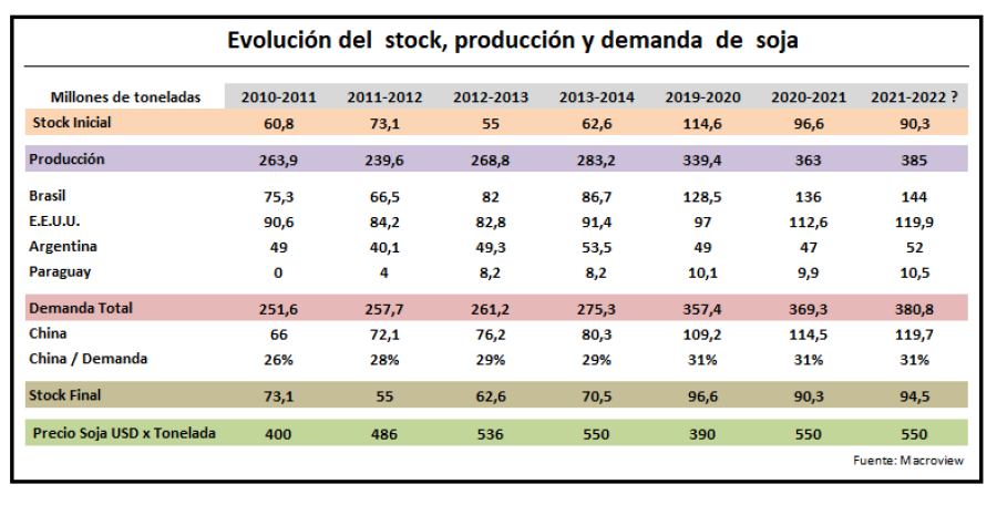 En cambio la producción en Argentina permanece estancada en torno a los 50 millones de toneladas, destacándose la aparición de Paraguay. Se plantea la incógnita si la producción seguirá siendo lo suficientemente dinámica para abastecer una demanda creciente o no, hasta el momento la oferta ha jugado en contra del sostenimiento de precios altos en el tiempo.