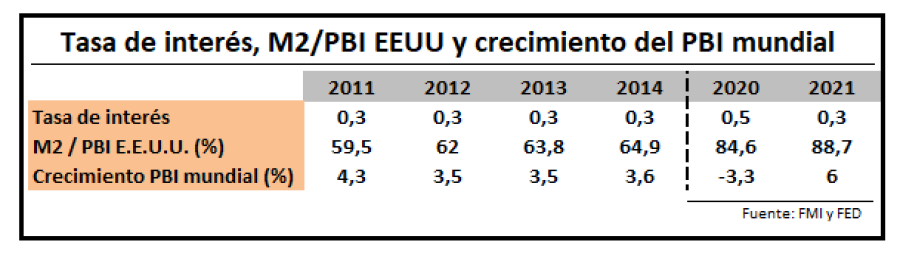 Los estímulos fiscales (déficit fiscal con relación al PBI del 14% en 2020 y 8% en 2021) y monetarios (emisión de USD 3,7 billones en el último año) aplicados para amortiguar los efectos de la crisis del Covid han impulsado la liquidez, manteniendo deprimida la tasa de interés, lo cual juega a favor del sostenimiento de precios altos en las commodities.