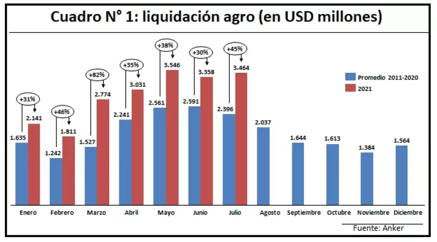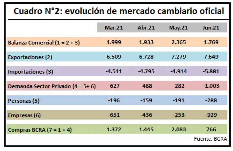Además, se aprovechó la suba de los precios internacionales para adelantar las ventas, con lo cual las exportaciones se acercarían a USD 6.000 millones en los próximos meses y las importaciones deberían tender a los USD 5.000 millones para dejar un saldo comercial USD 1.000 millones, a ser destinado a la demanda de dólares de personas y empresas (en junio compró 1/3 de lo comprado en mayo).