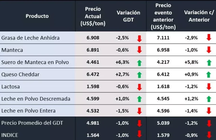 El mercado de referencia mundial de lácteos, GDT, promedió este martes una caída del 1% en el índice general de precios, con la novedad de su producto estrella, la LPE que cayó por tercera vez consecutiva y se ubicó en 4.532 US$/tn.