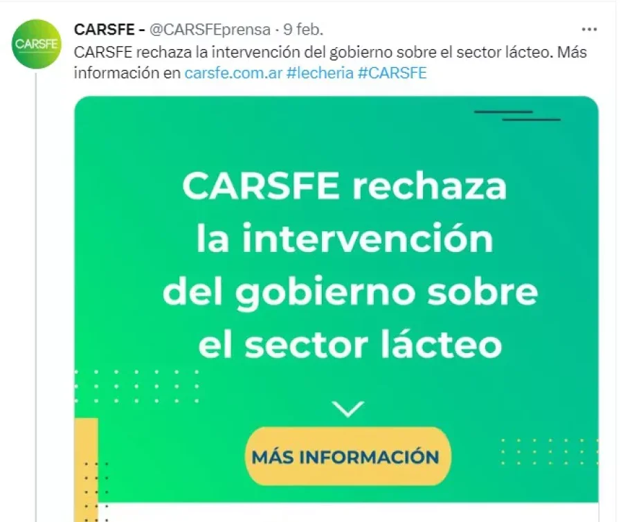 La Confederación de Asociaciones Rurales de Santa Fe (Carsfe) se pronunció en contra de las medidas anunciadas por el Gobierno en el tema carnes y rechazó cualquier intervención en el sector lácteo, a la vez que cuestionó la demora en la asistencia a productores afectados por la sequía.