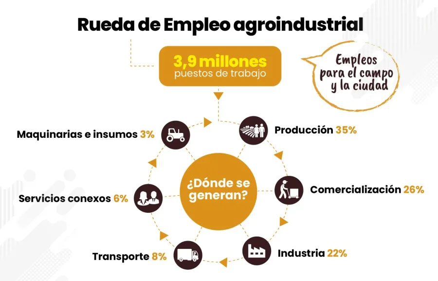 “Contrario a lo que suele pensarse, el eslabón primario es el mayor generador de trabajos, demandando el 35% del empleo de las CAI. La comercialización, considerando ventas por mayor y menor, ocupa el segundo lugar con el 26%, la industria representa el 22%, transporte y logística 8% y las cadenas proveedoras de bienes y servicios como insumos, bienes de capital, servicios conexos demandan el 9%”, explica Ariño.