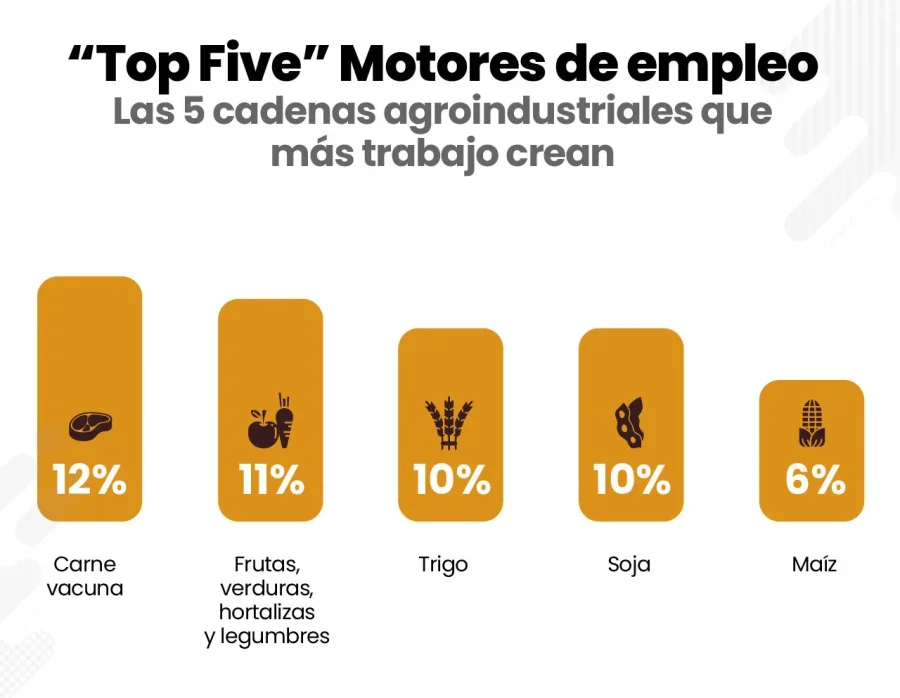 Según este informe, en 5 cadenas se generan la mitad de todo el empleo agroindustrial: bovina (12,4%), frutas, verduras y hortalizas (11%), soja (9,6%), trigo (9,5%) y maíz (6,4%).