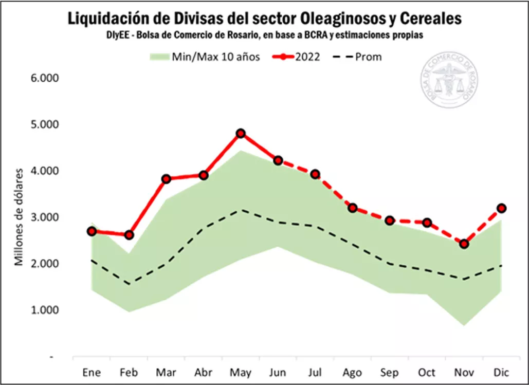 Incluso, “suponiendo que se sostenga el actual nivel de valores FOB para los granos y sus subproductos y en base a las actuales proyecciones de producción y exportación, así como también de la normativa que regula el comercio exterior de bienes agroindustriales, para el segundo semestre del año se espera una liquidación de divisas del sector agroindustrial por otros US$ 18.575 millones”, estimó esta semana la Dirección de Estudios Económicos de la Bolsa de Comercio de Rosario, a cargo del Dr. Julio Calzada.