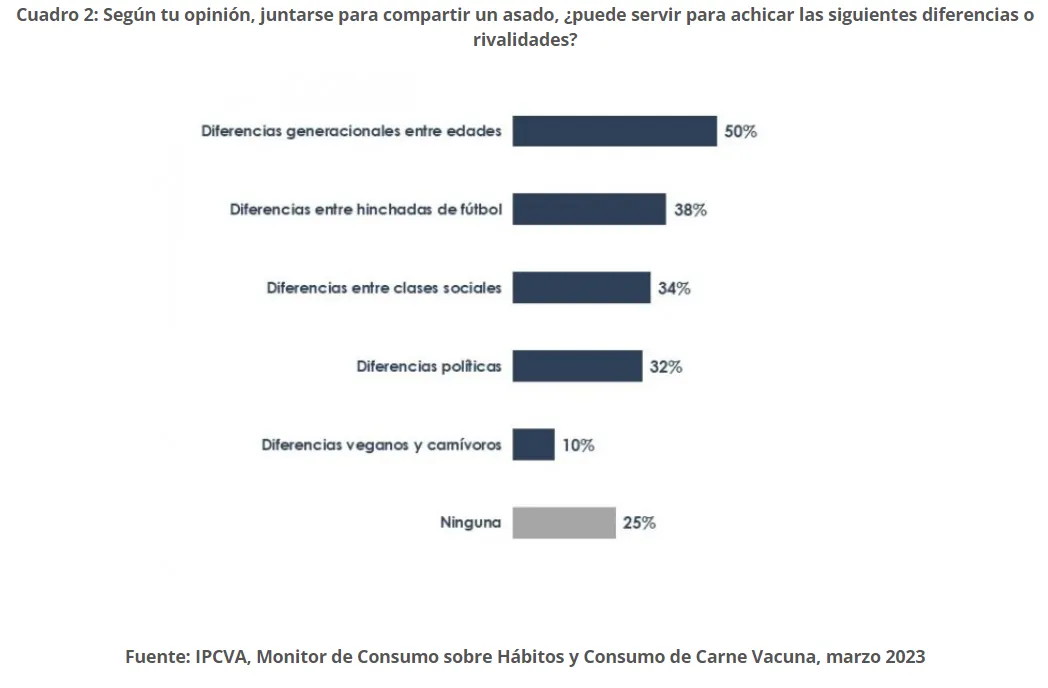 Desde el Instituto consultaron a los argentinos si juntarse para compartir un asado puede servir para achicar las diferencias o rivalidades existentes entre diferentes generaciones, hinchadas de fútbol, clases sociales, ideologías políticas y personas con distintas conductas alimentarias. Conversaciones cruciales, limar asperezas, acercar posiciones, arreglar los premios de un equipo de futbol, buscar coincidencias por qué no. Todo es posible alrededor del ritual cercano a una parrilla. “Un asado no hace milagros desde este punto de vista pero que ayuda, ayuda”, reconoció la gran mayoría. La picada multicolor, el olor a leña o carbón, el espectáculo sonoro y visual de las chispas y el humo, predispone bien para unirse más y dejar diferencias de lado.