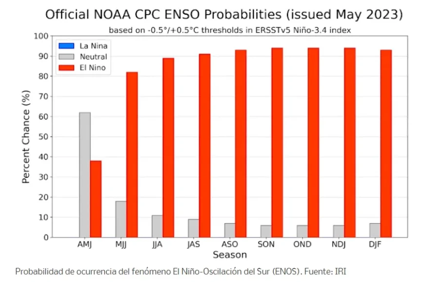 En este sentido, la docente de la FAUBA explicó que las variables oceánicas y atmosféricas claves son consistentes con el desarrollo de las condiciones de El Niño. “El mes pasado, el Climatic Prediction Center emitió una alerta de El Niño indicando el inicio de la fase cálida del ENOS. Para el próximo trimestre, entonces, el pronóstico oficial del ENOS que difundió el 11 de mayo el International Research Institute for Climate and Society -o IRI, por sus siglas en inglés- indica que existe una probabilidad del 89% para que se desarrolle un evento Niño”.