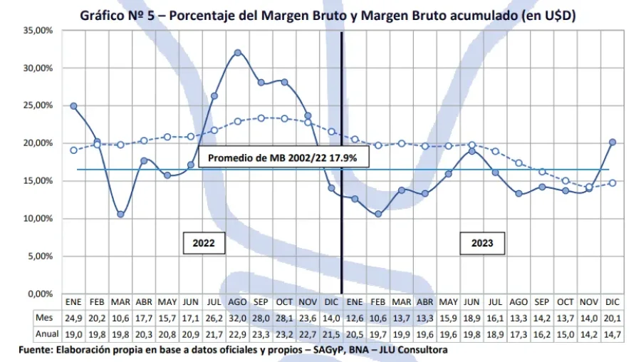 Al respecto, graficó: "en un solo día pasamos de tener un valor competitivo de US$ 1,16 el kilo vivo a dejar de serlo por la tarde con una cotización de US$ 1,57. Todo se subió a la carrera inflacionaria. Es importante mencionar que tanto el maíz como la soja, desde el mes anterior tenían una cotización especial del dólar y medio camino recorrido, por lo tanto, el golpe no fue tan fuerte. No así en los otros insumos que arman el costo, como los núcleos, los productos veterinarios y el material de reproducción, los cuales tuvieron una fuerte alza", indicó. Y agregó: "en toda esta confusión, y por los cereales, el margen bruto fue el mejor del año 2023, algo que podría tomarse como una ironía".