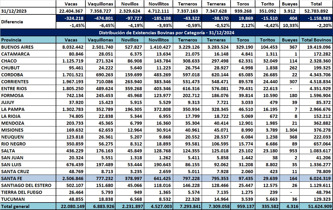 “El análisis y validación de la consulta de las existencias de bovinos al 31 de diciembre del 2024 del Sistema Informático de Gestión de Sanidad Animal (SIGSA) del Senasa, en conformidad con lo establecido en la Resolución MAGyP Nº 105/2019 y la Disposición ex SSG 6/19, cerró en 51.624.909 cabezas. La cifra representa una baja del 2,2% del rodeo nacional a partir de la sequía que afectó al sector”, confirmó la cartera que conduce Sergio Iraeta.