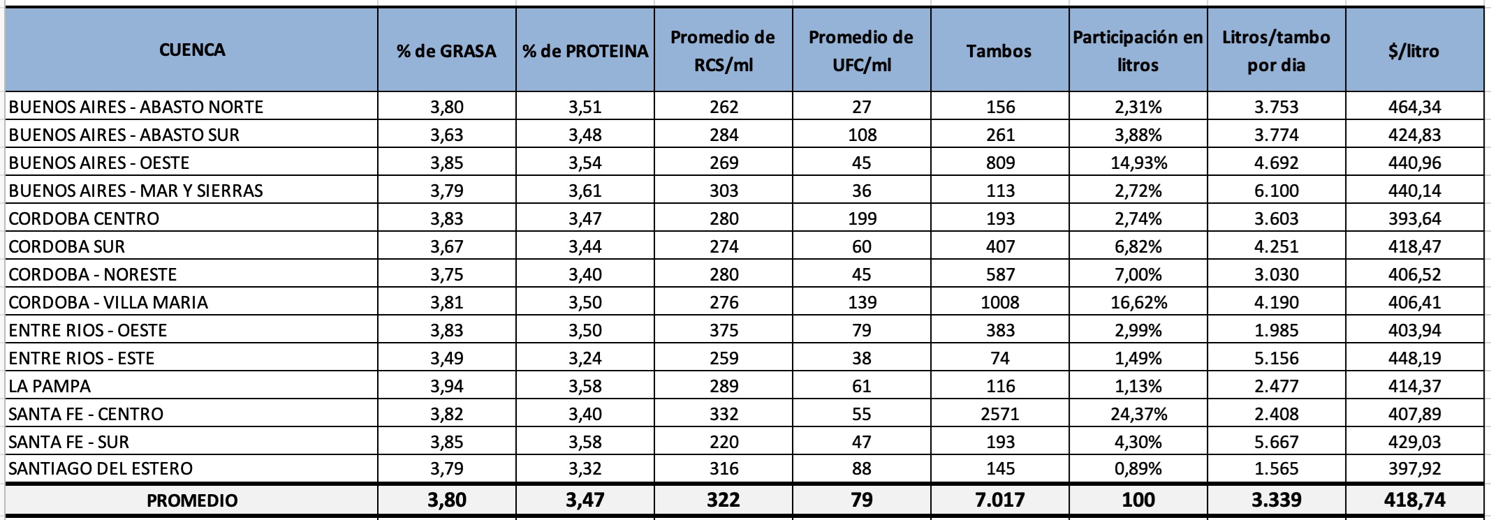 Según datos del SIGLEA con 7.677 liquidaciones de tambos y 373 industrias lácteas para el mes de agosto, la producción promedio diaria por tambo indica que Santa Fe Centro produjo unos 2.400 litros diarios/UP.